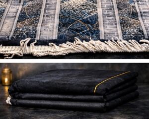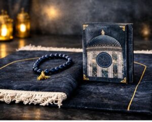 This set includes a soft padded prayer rug with an elegant dome-inspired design, along with a matching Qur’an and sebha to complete your spiritual essentials.
