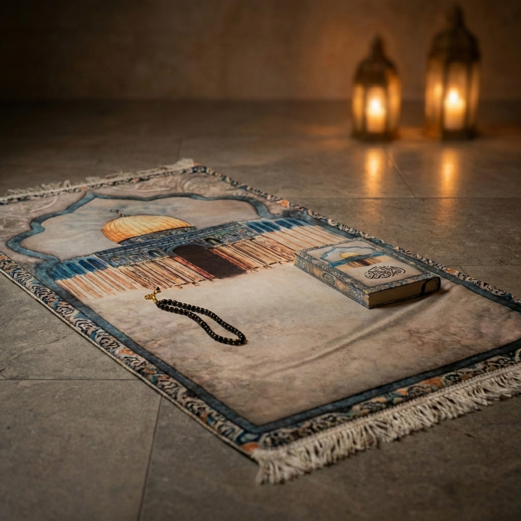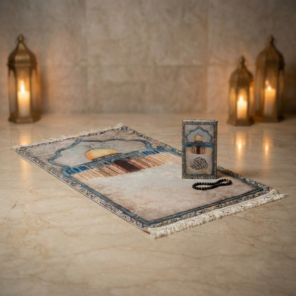 Inspired by the timeless beauty of the Dome of the Rock, this Premium Bundle brings heritage and elegance into your prayer space. Designed with intricate dome-inspired details and refined finishes, this set combines comfort, quality, and meaning in every element.