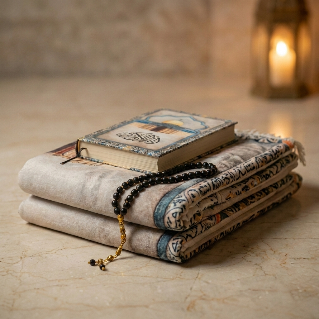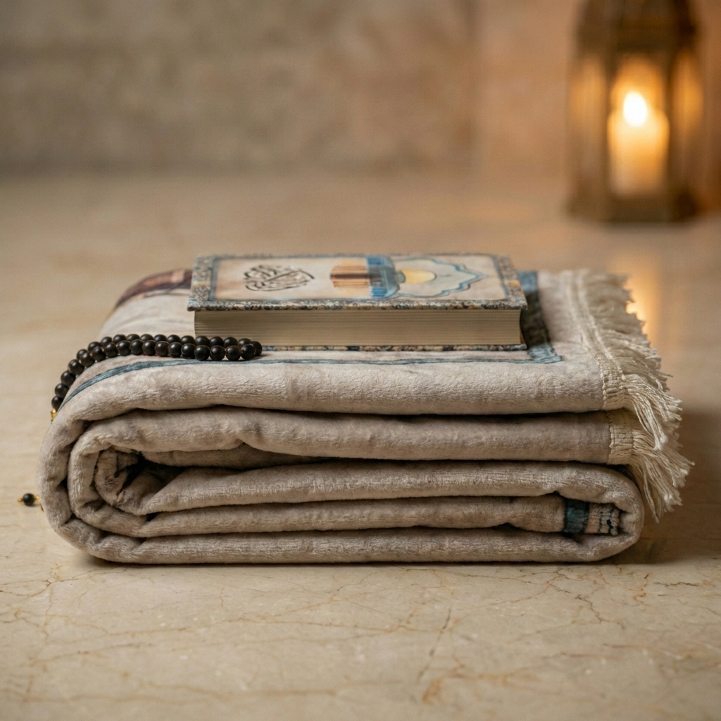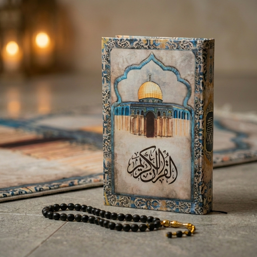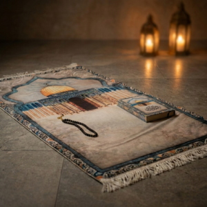 The Dome of the Rock Premium Bundle includes a luxuriously padded prayer rug paired with a matching Qur’an and sebha — creating a complete, harmonious set for your spiritual moments.