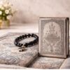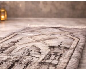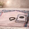 The set includes a padded prayer rug with detailed mosque engravings, paired with a matching Qur’an and sebha for a complete and refined prayer experience.