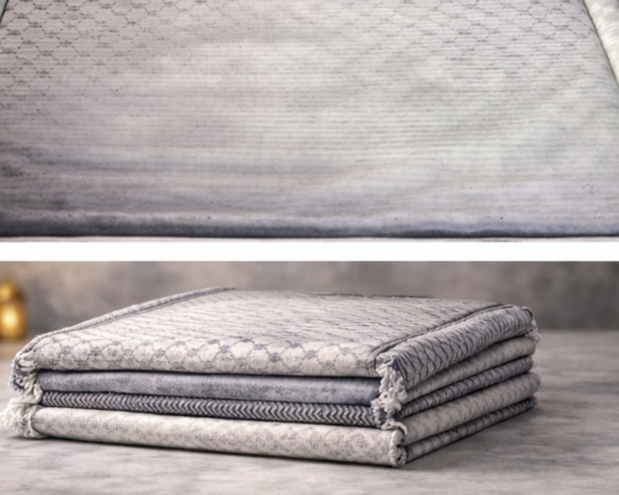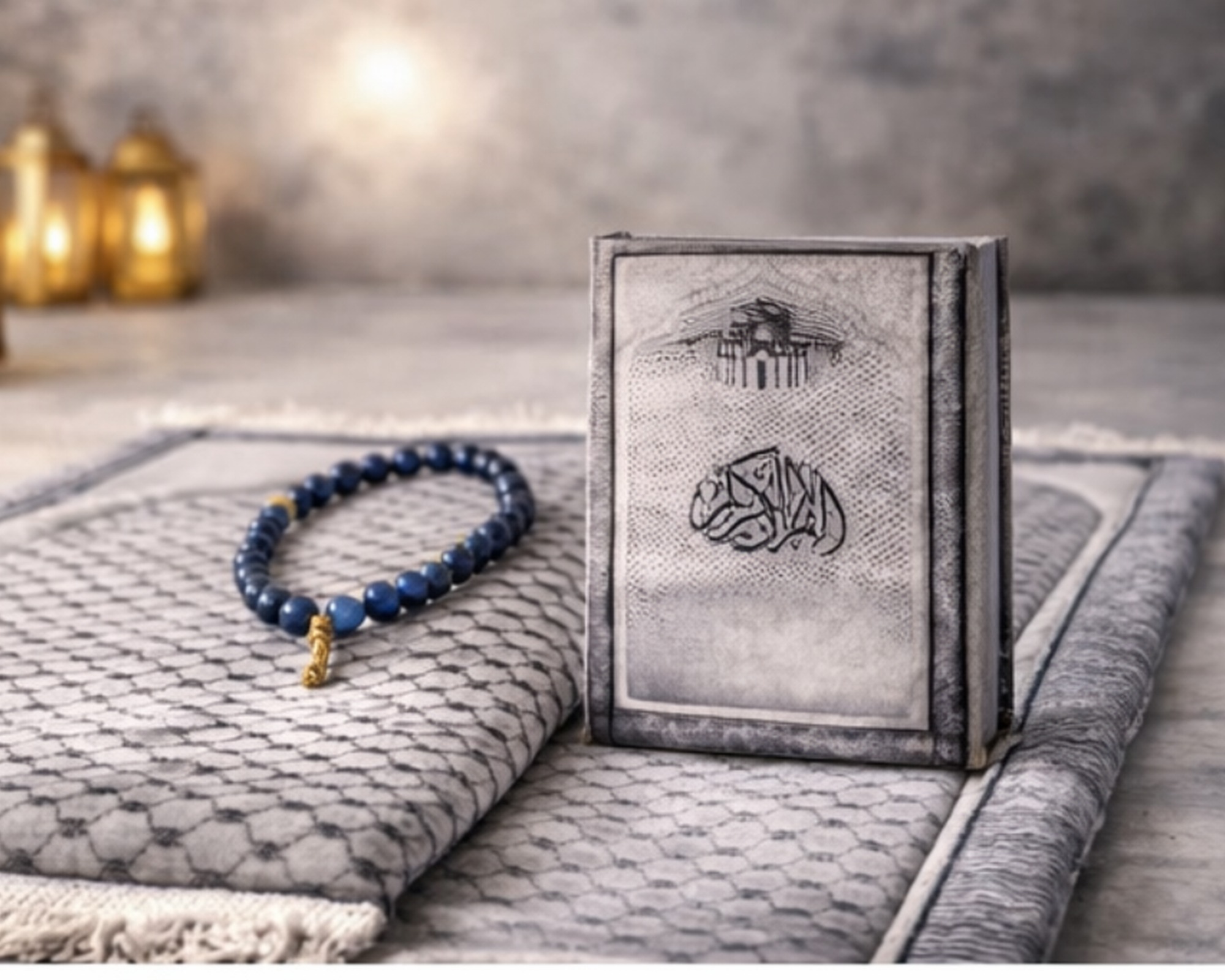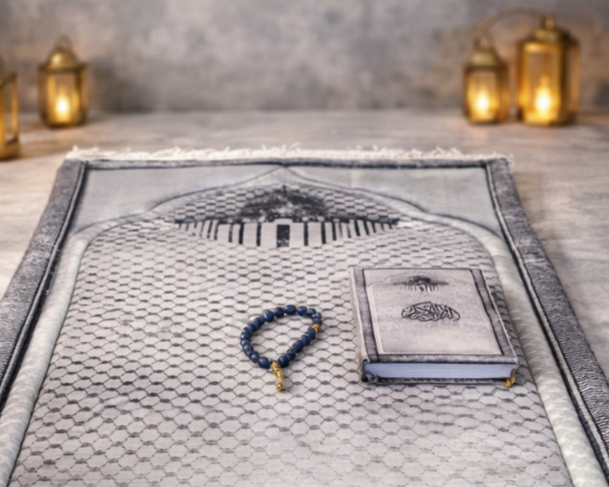 This premium set includes a soft padded prayer rug with a kufiya-inspired design, along with a matching Qur’an and sebha for a complete and thoughtful prayer experience.