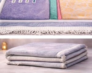 This premium set includes a soft padded prayer rug with a vibrant architectural design, paired with a matching Qur’an and sebha for a complete and uplifting prayer experience.